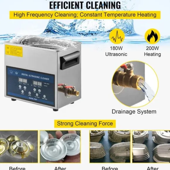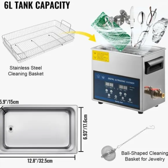 Tankstorlek: 6 l; Ingång: 220 V; Ultraschallkraft: 180 W; Ultraschallfrekvens: 28/40 kHz; Värmeeffekt: 200 W. Produkten är tillverkad av högkvalitativt rostfritt stål som är starkt, korrosionsbeständigt, rostfritt och läckagesäkert, vilket ger en längre livslängd.