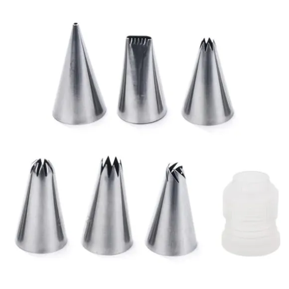 En uppsättning med sex konditorivaror med en tvådelad adapter. Extremt användbar för att skapa olika mönster och dekorationer på tårtor, tårtor, smörgåsar och cupcakes. De möjliggör enkel och effektiv dekorering av bakverk, vilket ger ett unikt utseende och karaktär. Spetsarna finns i olika former, vilket gör att du kan skapa dekorationer, samt forma olika mönster eller inskriptioner. Setet är lämpligt för både professionella konditorer och bakamatörer. Helt säker för hälsa och matneutral.