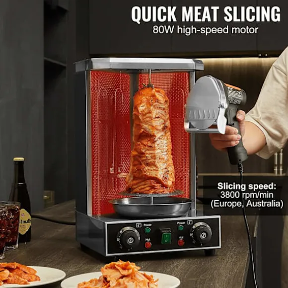 -Högeffektiv skärkraft: Vår shawarmakniv är utrustad med en kraftfull 80W motor för höghastighetsskärning av kött, vilket avsevärt förbättrar din kökseffektivitet.