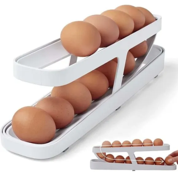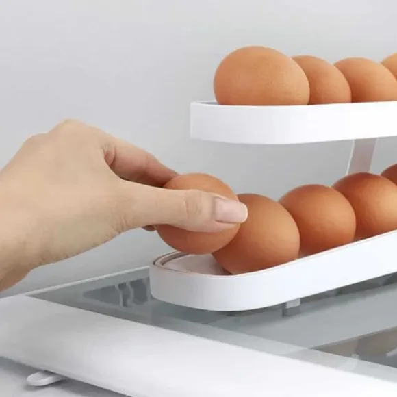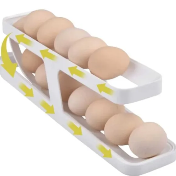 Äggdispenser – Praktisk och platsbesparande äggförvaring i kylskåpetTrött på dina ägg tar för mycket plats i kylskåpet? Vår smarta äggrullare är här för att göra ditt liv enklare! Med sin smarta design rullar ett ägg ut i taget från det vinklade spåret, redo att plockas upp. Så fort du tar ut ett ägg, rullar nästa direkt fram.Kompakt och Rymlig: Ägghållaren har två nivåer och kan rymma upp till ca 14 ägg vilket sparar värdefullt kylutrymme och håller dina ägg snyggt organiserade. Ägghållaren passar alla olika storlekar på ägg!Lätt att montera, använda och rengöra: Enkelt att montera, därefter lägger du bara dina ägg i äggdispensern och låt dem rulla. Tillverkad av kvalitets PP-material är den både stark och hållbar, vilket gör den till en långvarig lösning för din äggförvaring. Rengöringen är enkel så att du kan hålla den fräsch utan krångel.Mått: ca 35*8*10cm (monterad)Färg: Vit