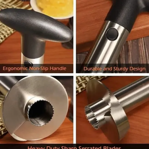 Mått: 24×8,5cm. Med vår ananasskärare i köket, skala, kärna ur, skiva och skär ananas från dess hårda, taggiga yttre kärna utan ansträngning. Lämplig för matlagning, ananas frukt, fruktskivor, hålla ana fräsch