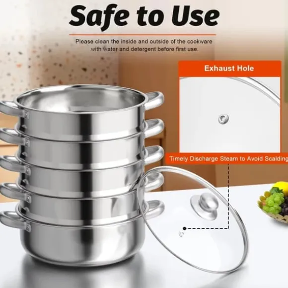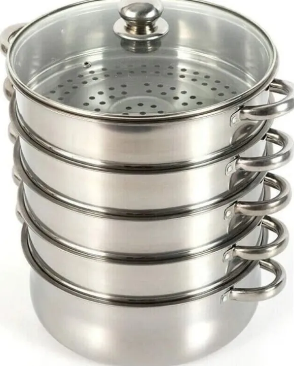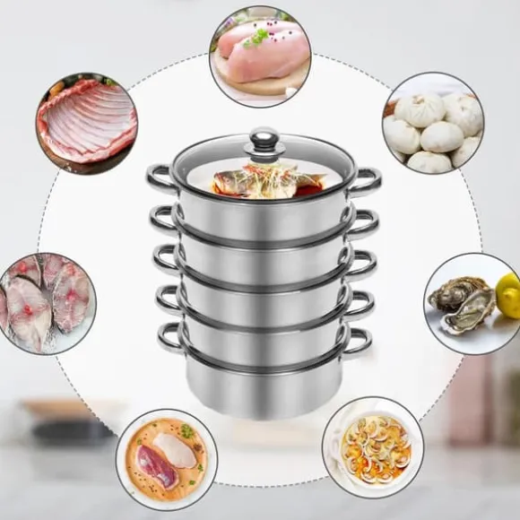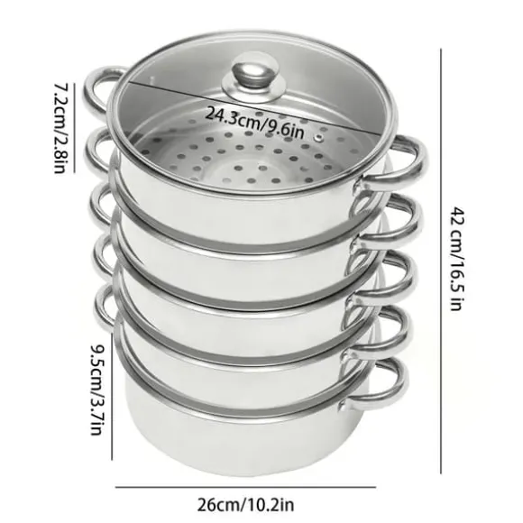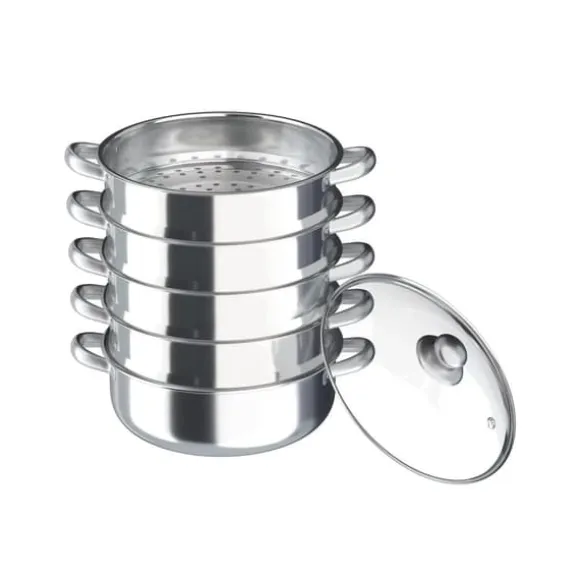 5‑lagad ångkokare i rostfritt stål 26 cmEn mångsidig ångkokare i livsmedelsgodkänt, polerat rostfritt stål med 26 cm diameter. Den 3‑skikts kompositbottnen ger jämn värme, och förtätade ånghål cirkulerar ånga snabbare för skonsam och snabb matlagning av flera rätter samtidigt.
