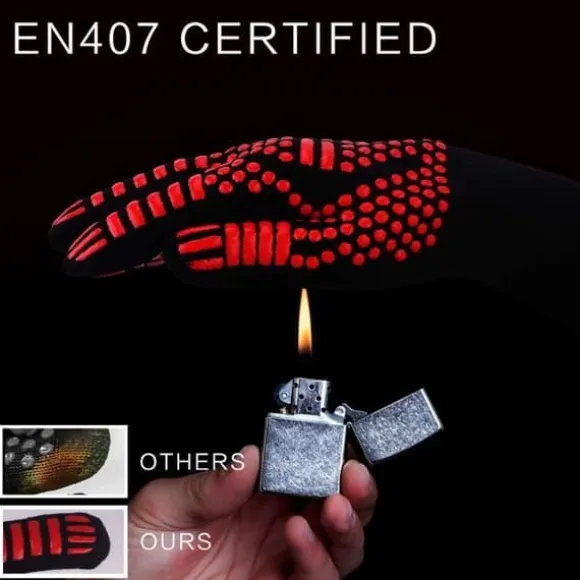 Grillhandskarna är EN 407 och EN 420 certifierade Hemligheten med dessa flamskyddade och certifierade handskar är en kombination av aramidfibrer och halkfria silikonremsor, som möjliggör en ny generation av säkerhet mot extrem värme från 250°C till 800°. C. Handskarna är dessutom halk- och skärtåliga, bekväma och tvättbara.