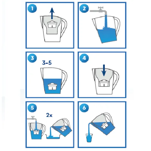 Använda kannapatroner Innan första användningen, blötlägg patronen i vatten i cirka 5 minuter för att lufta och aktivera den. Patronen ska placeras i en behållare för ofiltrerat vatten, häll sedan vatten i den och filtrera hela behållaren. Upprepa hela processen två gånger. Njut av kristallklart och säkert kranvatten!
