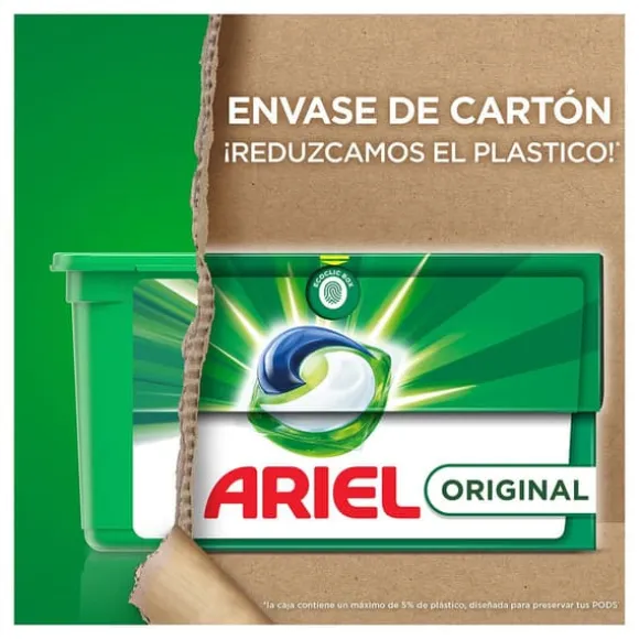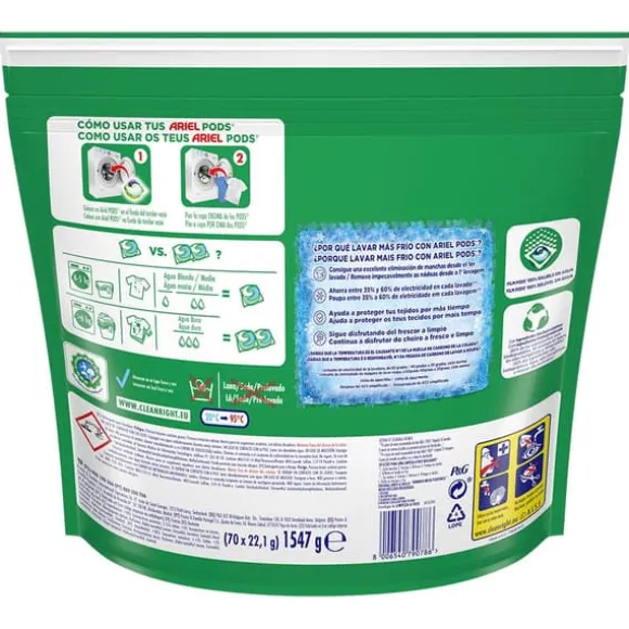 Den detergent som finns i tvättmaskinens alla-i-ett-pods av original Ariel rengöring och fräschhet ger 5 åtgärder för extraordinär kall rengöring (vatten, oorganiska salter och mineraler) 5. Utmärkt för en kallare tvätt.Det har utformats för kall tvättning, med den exklusiva rengöringsteknologin.När den kommer i kontakt med vatten löser fodralet med 100 % lösliga pods upp sig i vattnet och släpper ut sin kraftfulla fjärrteknologi.En djupare och starkare rengöring tack vare allt i ett Clean & Fresco Pods.Dessutom kommer Ariel-kapslarna i en återvinningsbar behållare.VARNING: Denna produkt kan vara skadlig och orsaka allvarliga skador. Förvara alltid Ariel-kapslarna i ett pods utom räckhåll för barn.Besök Keepcapskids.eu för mer information.Funktioner: 5 ljusa kalla rengöringsåtgärder: 1. Ta bort fläckar. 2. Illuminator. 3. Intensiv doft. 4. 80% biologiskt nedbrytbara ingredienser, förutom vatten, oorganiska salter och mineraler. 5. Utmärkt för en kallare tvätt. Kall effektiv: Den detergent som finns i Ariel-kapslar allt i ett Pods inkluderar den exklusiva rengöringsteknologin. Förbättrad fräschör: Den detergent som finns i Ariel-kapslar allt i ett pods är utformad med en förbättrad fräschör. Pods Colas 100% löslig i vatten: Den detergent för tvättmaskin Ariel Pods har ett pods med 100% vattenlösligt fodral. Återvinningsbar behållare: Ariel Everything in one pods kommer i återvinningsbara behållare. Tvätta vid lägre temperaturer med Ariel Everything in one Pods: Spara energi i varje tvätt och minska utsläpp av koldioxid vid gjutning. Lätt att använda: Utan att mäta eller hälla, behöver du en Ariel-tvätttablett i ett pods. Utmärkt för rengöring, inte för barns händer: Förvara alltid allt i ett pods utom räckhåll för barn. Besök Keepcapskids.eu för mer information. Varningar: orsakar allvarliga ögonskador. Orsakar hudirritation. Skadligt för vattenlevande organismer, med bestående effekter. Förvaras utom räckhåll för barn. Vid ögonkontakt: skölj noga med vatten i flera minuter. Vid hudkontakt: tvätta med mycket vatten. Vid förtäring: skölj munnen. Ort inte kräkningar. Ring omedelbart ett toxikologi/läkarcentrum. Ät inte. Vid olycka kontakta Toxicological Information Medical Service, Telefon 91 562 04 20. Innehåller MEA-C10-13 Alkyl Benzenesulfonat, Mea-Laureth Sulfat, C12-14 Pareth-N. Det innehåller tetrahydrolinalool, tetramethylacetylocthydronaphthalener, Methylundecanal. Kan orsaka en allergisk reaktion. Använd med torra händer. Riv inte, bryt inte eller skär inte. Anvisningar:1. Placera en pods® Ariel längst ner i den tomma trumman. 2 Lägg kläderna på Pods®. Ingredienser:> 30% tensioactive anioniska, 5-15% tvål,