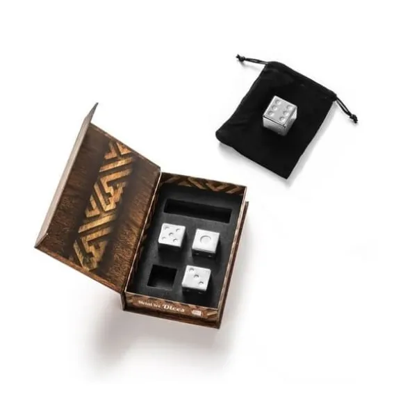 Dessa originella isbitar ger en elegant touch till dina glas. De föreställer tärningar. De är tillverkade av rostfritt stål och går att återanvända hur många gånger som helst. De levereras i en presentlåda för att ges som gåva till en festglad vän. * Material: rostfritt stål * Mått på en kub: 2,5 x 2,5 x 2,5 cm * Set med 4 isbitar * Förvaringspåse i sammet * Presentlåda * Placera i frysen i 4 timmar.