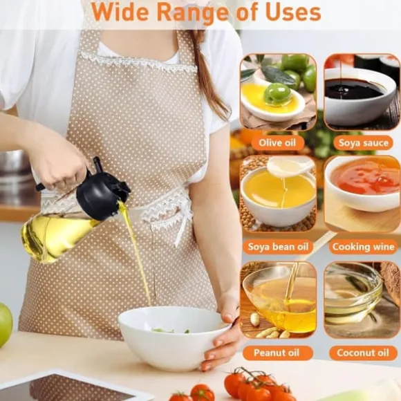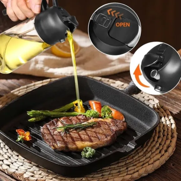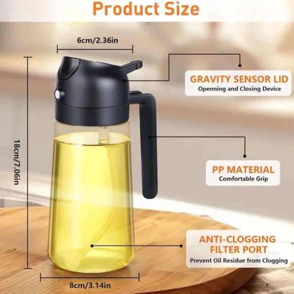 Enkel att använda: Bred öppning för enkel påfyllning av matolja; kan handdiskas eller rengöras i diskmaskin, återanvändbar. 470 ml kapacitet är lagom och minskar behovet av påfyllning utan att bli otymplig.