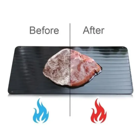 Denna avfrostningsbricka i aluminium gör att du snabbt kan tina upp din frysta mat. Med sina mått på 29,5 x 20,5 cm är den idealisk för kött och frukt. Dess svarta färg och rektangulära design passar perfekt in i ditt kök.