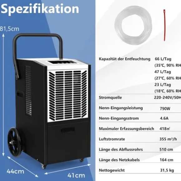 - Avfuktningskapacitet: 66 L/dag (vid 35°C, 90% luftfuktighet)