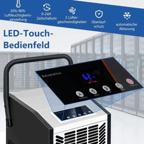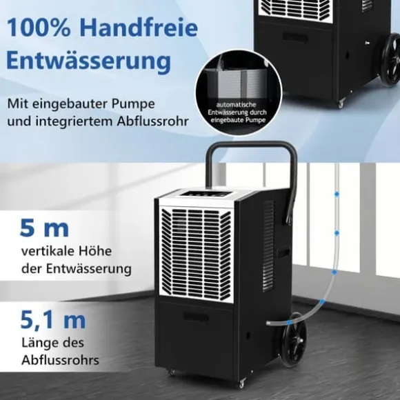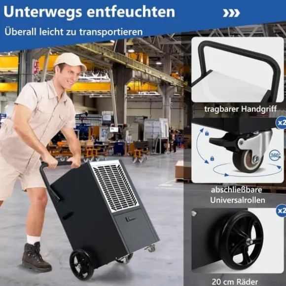 Denna kommersiella avfuktare tar effektivt bort överflödig fukt från stora ytor, vilket gör den idealisk för fuktiga källare, byggarbetsplatser och restaureringsprojekt. Den har bekväma kontroller, kontinuerlig dränering och enkel rörlighet för mångsidig användning i olika miljöer.