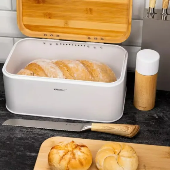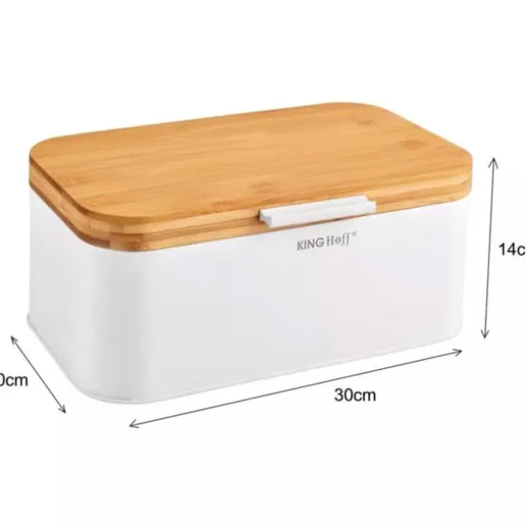 Brödbehållaren är designad för förvaring av alla sorters bröd. Tack vare sin ursprungliga design kommer det att bli ett intressant dekorativt element i alla kök. Funktioner: Skyddar bröd och bakverk från att torka ut och förlora sin arom. Stomme av rostfritt stål, pulverlackerad vit. Lock av högkvalitativt bambuträ med vitt stålhandtag. Lätt att använda och rengöra Mått: Storlek: 30x20x14cm