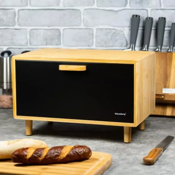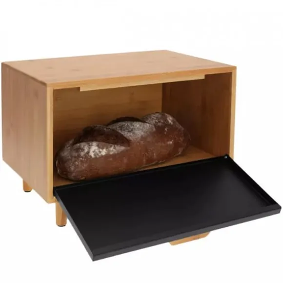 KLAUSBERG bambu brödlåda – Tillverkad av hygieniska och ekologiska material. – Bambu träkropp, nedåtgående dörr, tillverkad av pulverlackerat stål – Slitstark och solid konstruktion. – För förvaring av alla typer av bröd, frallor, perfekt för förvaring av kakor, – Dörrfärg: svart – Storlek: 38 x 26 x 23 cm