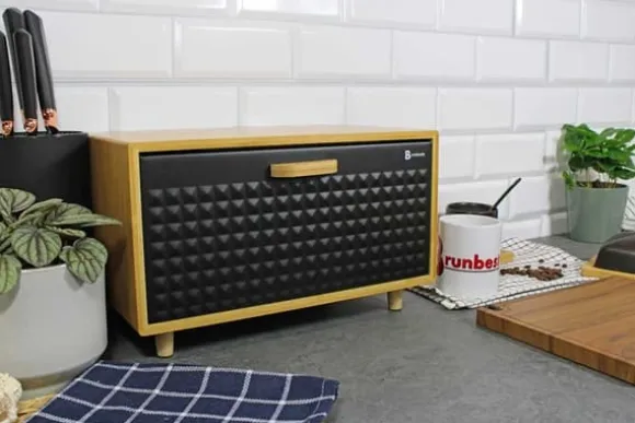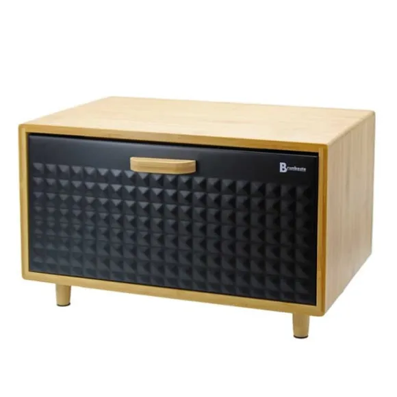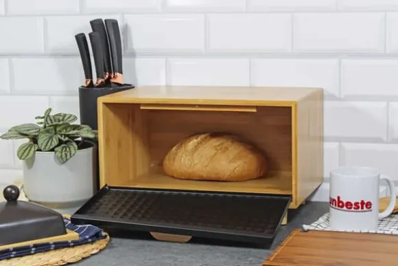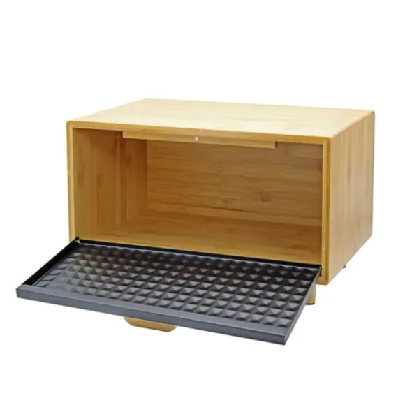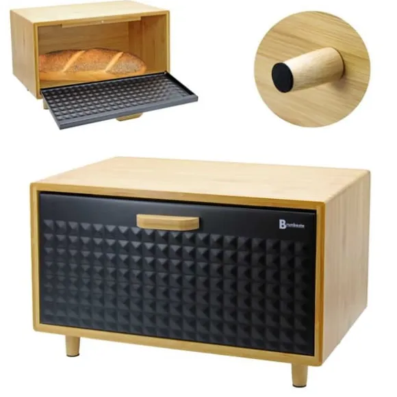 Modern och stilren brödlåda med en kropp gjord av naturligt bambuträ. Den har en gångjärnsförsedd stålkåpa i en elegant svart färg, dekorerad med karakteristisk prägling som ger den ett unikt utseende. Tack vare sin ergonomiska design ger den enkel tillgång till bröd, och gedigna material garanterar hållbarhet och hygienisk förvaring. Den perfekta kombinationen av funktionalitet och estetik som passar perfekt in i alla kök. Stomme av bambusträ med gångjärn framtill av svart stål med karaktäristisk prägling och trähandtag. Lätt att öppna. Sparar utrymme. Designad för förvaring av alla typer av bröd. Attraktiv, modern design. Träben för stabilitet. Tillverkad av ekologiska material. Förpackning: färgad kartong. Mått på brödlådan: 35,5 x 20 x 21,5 cm