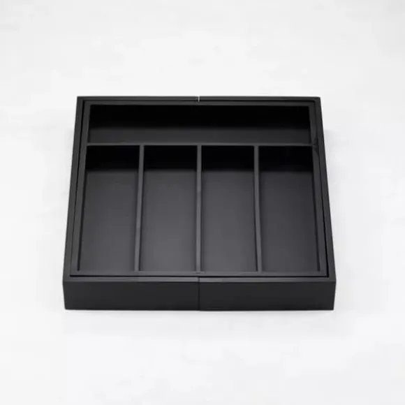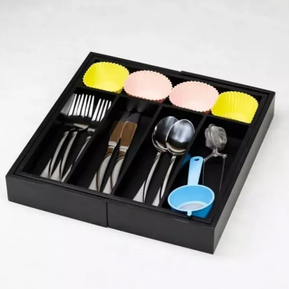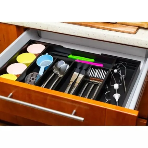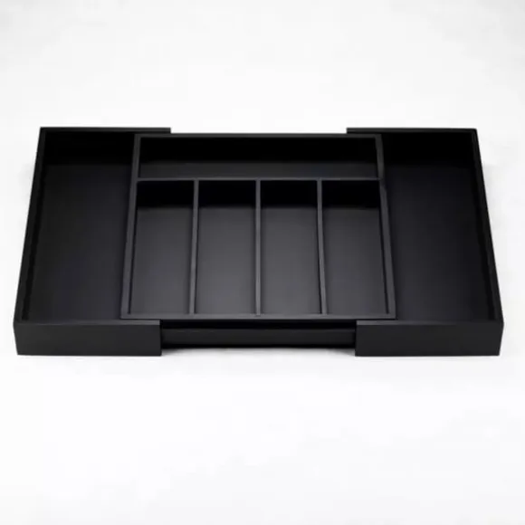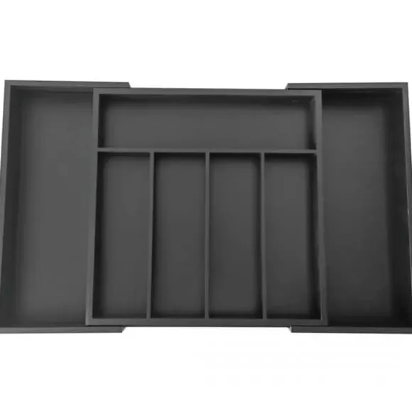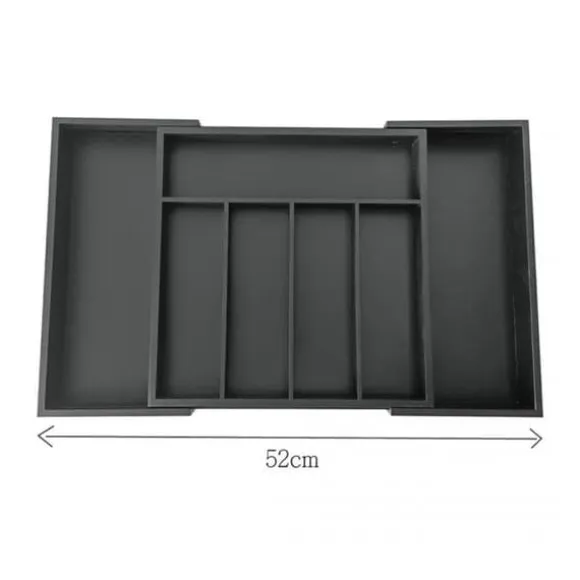 EXPANDERBAR BAMBUINSTÄLLNING FÖR BESTICK OCH KÖK Husgeråd 100 % naturligt bambuträ målat svart, hållbar, högkvalitativ konstruktion, 7 långa fack. Perfekt för köksredskap, verktyg och bestick Två utdragbara sidodelar ger extra utrymme Slitstark och lätt att rengöra Maximerar användningen av utrymme Passar de flesta standardlådor Mått på den slutna lådan: 31×31,5x5cm Mått på den förlängda lådan: 52×31,5x5cm