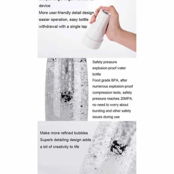3、 Det nya PET-maten är säkert att använda. Den bärbara kolsyrade vattenmaskinen är liten i storleken och kan tas ut eller läggas i en påse.