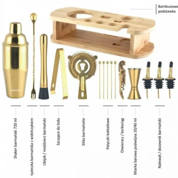 Det coolaste sättet att förvara och visa dina barverktyg i ett ställ, noggrant designat för att hålla dina barverktyg organiserade och tillgängliga hela tiden. Du kommer aldrig att uppleva röran i dina kökslådor och skåp igen. Visa upp ditt underbara cocktailset med ett unikt förvaringsställ. Detta kan vara en perfekt presentidé. Du kommer definitivt att locka dina gästers uppmärksamhet En solid, hållbar, tung, högkvalitativ uppsättning bartillbehör för att göra cocktails, gjord av guldfärgat rostfritt stål. Lätt att rengöra för hand: Efter att ha använt varje del av shakersetet, skölj det helt enkelt med varmt vatten, tvätta det med ett milt rengöringsmedel med en mjuk svamp, skölj det och torka det torrt. Genom att följa dessa regler kommer cocktailshakern att se ut som ny i många år. Satsen innehåller: dubbelsidig mätkopp 20/40 ml – ”jigger” – 3 st tång – 1 st lång sked, bartendersked med gaffel – 1 st cocktail bartenderstöt ”muddler” – 1 st issil – 1 st vinöppnare – 1 st bambu.