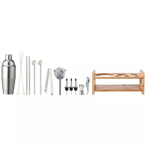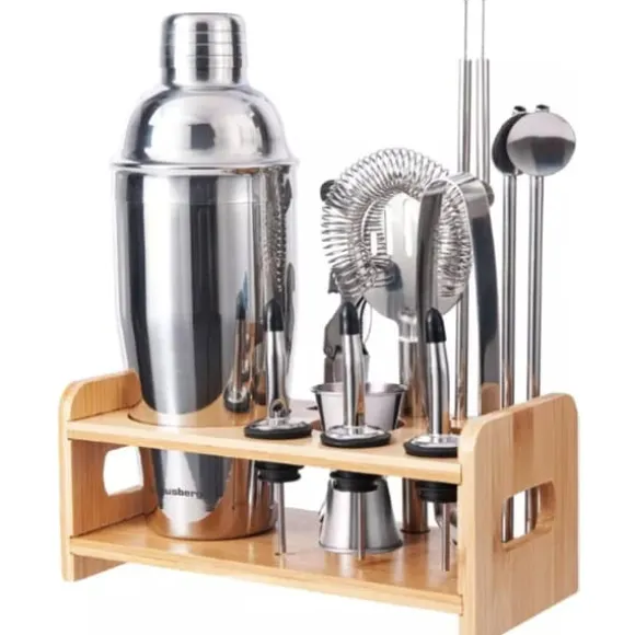 Upptäck den eleganta kombinationen av funktionalitet och design i vårt barware-set. Skapat med riktiga bartenderentusiaster i åtanke, det här setet kommer inte bara att organisera ditt köksutrymme, utan kommer också att bli dekorationen för alla hemmabarer. • Hög kvalitet: Hela setet är tillverkat av glänsande, hållbart rostfritt stål, vilket inte bara tillför elegans utan också garanterar produktens livslängd. • Unikt stativ: Noggrant utformat stativ som inte bara presenterar dina verktyg perfekt, utan också säkerställer enkel åtkomst till dem hela tiden. • Ergonomiska verktyg: Varje verktyg är designat med komfort i åtanke, vilket gör det lättare att förbereda dina favoritcocktails. • Skräpfritt: Glöm stökiga lådor och skåp. Allt du behöver, alltid till hands. • Lättskött: Alla setkomponenter är lätta att rengöra. Skölj helt enkelt med varmt vatten, tvätta försiktigt och torka torrt för att njuta av deras oklanderliga utseende i många år framöver. • Perfekt som present: Ett cocktailshakerset är en perfekt presentidé för alla drinkälskare. Upplev den sanna glädjen att skapa och servera cocktails med vårt unika cocktailshakerset. Du kommer säkert att locka dina gästers uppmärksamhet och få deras erkännande. Produktegenskaper Helt ny, högkvalitativ produkt. Med detta set kan du spela barkung i ditt eget hem. Perfekt gjord av rostfritt stål. Förpackning: bartender-set innehåller 1 st Cocktailshaker – 20/40ml, 2 st Stångsked – 10,5 cm, 1 st. 2 st Stålhalm 2 st Halmrengöringsborste 1 st Trästativ
