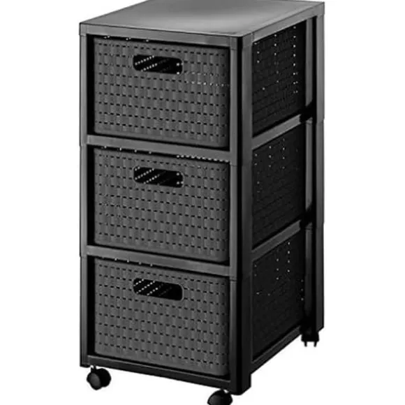 RULLKONTENJER ROTHO Country, med 3 BPA-fria plastlådor, erbjuder en kapacitet på 18 liter var och en. Dess design i anthracite rotting passar perfekt in i badrummet, köket eller barnrummet. Lätt att flytta tack vare sina 4 hjul, kombinerar den praktisk användning med estetik.