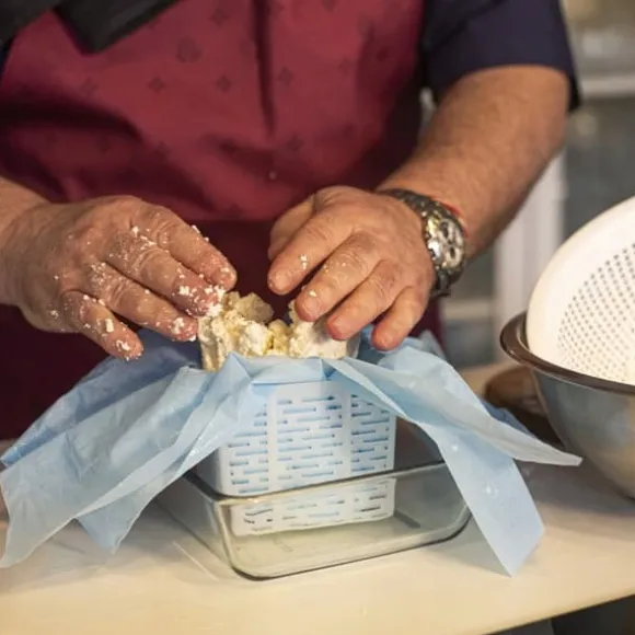 - För att uppnå bästa möjliga vassleavrinning och jämnhet av osten, placera ostmassan på den inre, släta sidan av duken.