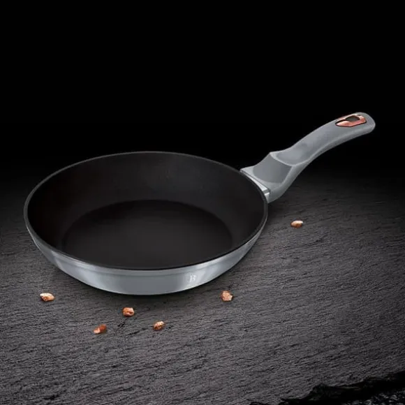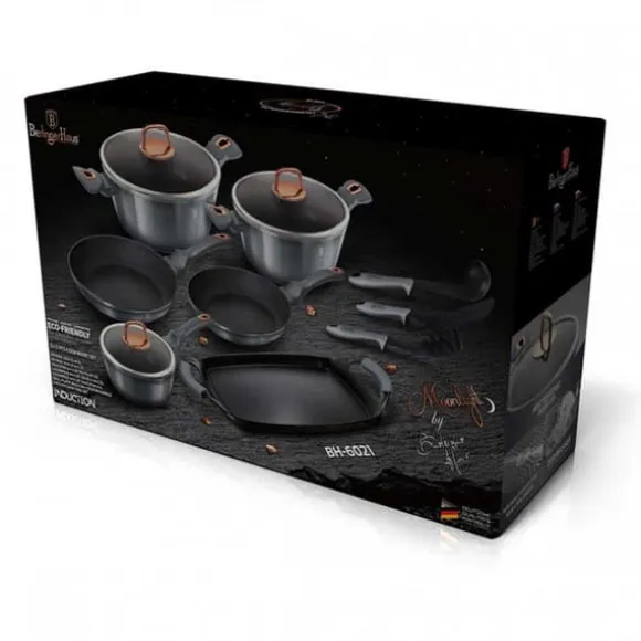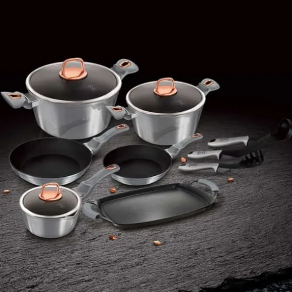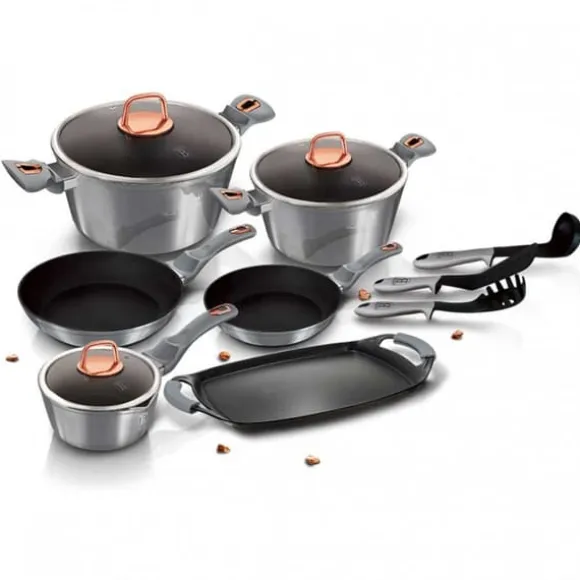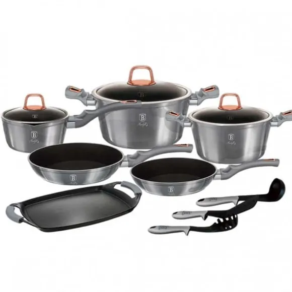 Grytor och kastruller från METALLIC-serien från BERLINGERHAUS är gjorda av högkvalitativt smidd aluminium täckt inuti med en trippel granitbeläggning (marmor) med en mycket hög hårdhetskoefficient. Ytterbeläggningen finns i flera färgversioner med en karakteristisk metallisk glans. Dessa snygga och fashionabla rätter är utrustade med SOFT TOUCH-handtag (silikonhandtag) som standard. Lämplig för alla typer av spisar: gas, el, keramik, halogen, induktion. TURBO INDUCTION-systemet (värms upp mycket snabbt) gör att du kan spara upp till 35 % energi. Satsen innehåller: gryta med lock Ø20 x 10cm (2,5L) gryta med lock Ø24 x 12cm (4,5L) kastrull med lock Ø16 x 7,5cm (1,7L) stekpanna Ø22 x 4,5cm stekpanna Ø24 x 4,8cm Utmärkt grillplåt 36x23cm Kökskärl med hög kvalitet (3 st aluminium Soft-Touch Handtag: silikonhandtag TURBO INDUCTION-system (värms upp mycket snabbt) 35 % energibesparing Tål maskindisk För alla typer av spisar: gas, el, keramik, halogen, induktion Färg: Moonlight Granitbeläggningen är en teflonbeläggning berikad med granitdamm, tack vare vilken den får större hårdhet. Det är hårdare än teflon, men behåller sina fördelar: det brinner inte och fördelar värmen bra. Kombinerar fördelarna med kokkärl i gjutjärn och teflon. Den har alla fördelar med teflon, men är mer motståndskraftig mot skador och överträffar till och med keramiska beläggningar. Granitbeläggningen gör disken exceptionellt reptålig och hållbar. Denna typ av grytor och stekpannor tillåter också stekning med en minimal mängd fett, eftersom kärlet värms upp på samma sätt som en sten och avger värme över hela ytan. Sammansättningen av aluminiumkroppen och den ferromagnetiska botten möjliggör användning på induktionsspisar och alla andra typer av spisar och användning av de bästa acktermiska egenskaperna hos gjutet och smidd aluminium på alla spisar och spisar.