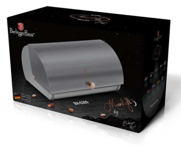 En elegant väska från Berlinger Haus från Moonlight Edition-linjen. Specifikation: längd: 38 cm / bredd: 28 cm / höjd: 18,5 cm Ytterligare information: Brödlåda av silverkolstål. Lock i grått och silver (månsken) Lätt att öppna utan att ta extra utrymme Avsedd för förvaring av alla typer av bröd Förpackning: färgad kartong