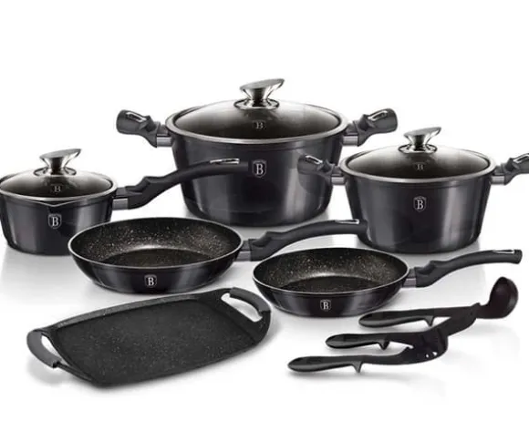 Kökskärlet i serien CARBON PRO från BERLINGER HAUS är tillverkat av högkvalitativt gjutet aluminium täckt med en trippel granitbeläggning (marmor) med en mycket hög hårdhetskoefficient. Ytterbeläggning i metallisk grafitfärg. Dessa snygga och fashionabla rätter är som standard utrustade med SOFT TOUCH-handtag (silikonhandtag). Lämplig för alla typer av spisar: gas, el, keramik, halogen, induktion. TURBO INDUCTION-systemet (de värms upp väldigt snabbt) gör att du kan spara upp till 35 % energi. Setet innehåller: Gryta Ø20 x 10,4cm 2,5L Gryta Ø24 x 11,8cm 4,1L Kastrull Ø16 x 7,5cm 1,2L Stekpanna Ø20 x 4,5cm 1L Stekpanna Ø24 x 4,8cm 1,7L Grillplåt 32 x 36cm (kan användas på 36cm) spisen och i ugnen) Köksredskap gjorda av termoplastisk nylon: – spagettisked – spatel – sked Egenskaper: Trippel granitbeläggning för att förhindra att mat fastnar Material: högkvalitativt gjutet aluminium Soft-Touch Handtag: silikonhandtag Glasskydd med luftventil medföljer TURBO INDUCTION system (värms upp mycket snabbt) 35 % energibesparing Tål diskmaskin För alla typer av spisar: gas, el, keramik, halogen, induktion Färg: metallisk grafit Granitbeläggningen är en teflonbeläggning berikad med granitpulver, tack vare vilken den får större hårdhet. Det är hårdare än teflon, men behåller sina fördelar: det brinner inte och fördelar värmen bra. Den kombinerar fördelarna med kokkärl i gjutjärn och teflon. Den har alla fördelar med teflon, men är mer motståndskraftig mot skador, till och med överlägsen keramiska beläggningar. Granitbeläggningen gör disken exceptionellt reptålig och hållbar. Denna typ av grytor och stekpannor låter dig också steka med en minimal mängd fett, eftersom kärlet värms upp på samma sätt som en sten och avger värme över hela ytan. Sammansättningen av aluminiumkroppen och den ferromagnetiska botten tillåter användning på induktionsspisar och alla andra typer av spisar och de bästa ac-termiska egenskaperna hos gjutet och smidd aluminium på alla spisar och värmeplattor.