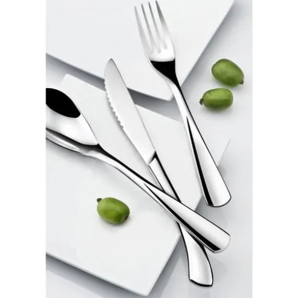 Upptäck 24-delarsbestickssetet från AMEFAs Vision-serie. Tillverkade i rostfritt stål med en glänsande finish, förenar dessa bestick elegans och ergonomi med sina vågiga handtag. Perfekta för daglig användning, diskmaskinsvänliga.