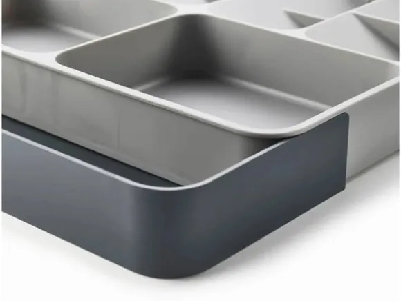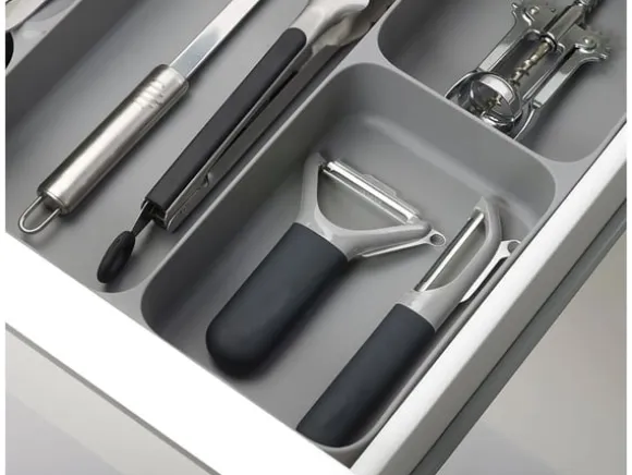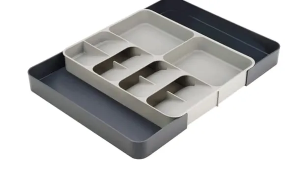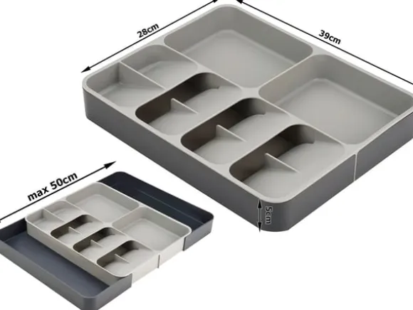 Få ordning och reda i kökslådan med denna smarta bestickinsats! Den rymliga designen gör det enkelt att sortera knivar, gafflar, skedar och andra köksredskap. Den justerbara formen anpassar sig efter lådans storlek, vilket ger en flexibel lösning för alla kök.
