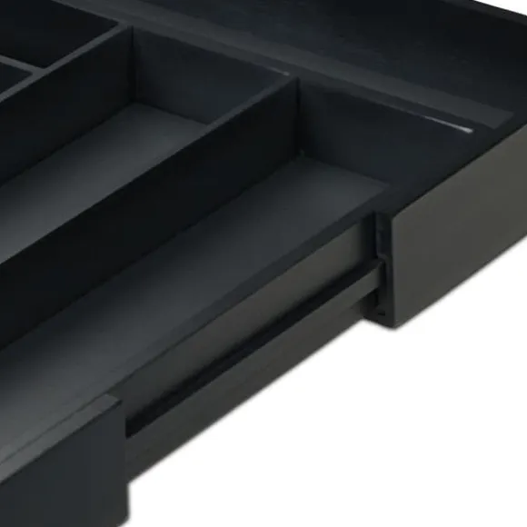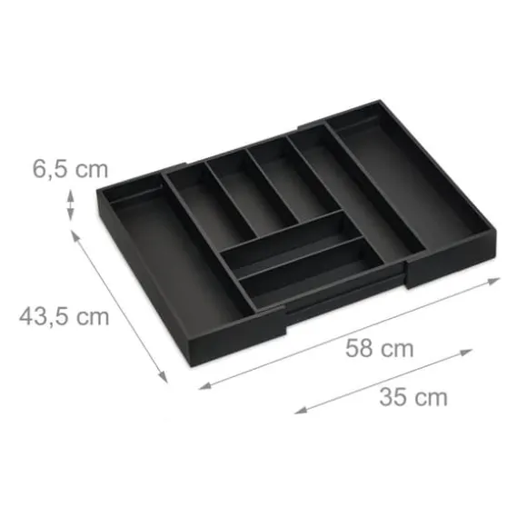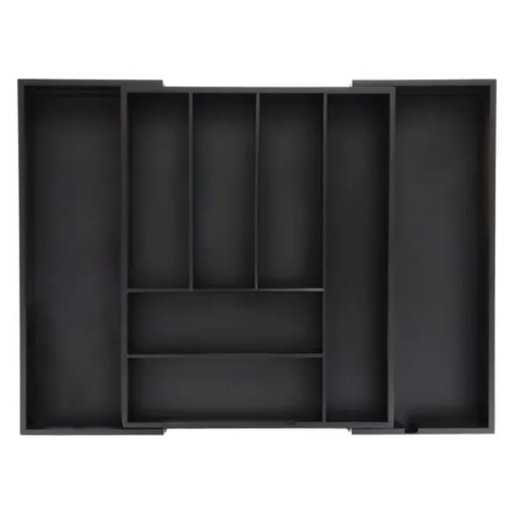 Håll dina kökslådor organiserade och prydliga med denna mångsidiga besticklåda i bambu. Med flera fack och justerbar bredd erbjuder den gott om plats för bestick, köksknivar och redskap samtidigt som den passar snyggt i olika lådstorlekar. Den robusta svarta designen kombinerar stil med praktisk användning för vardagen.
