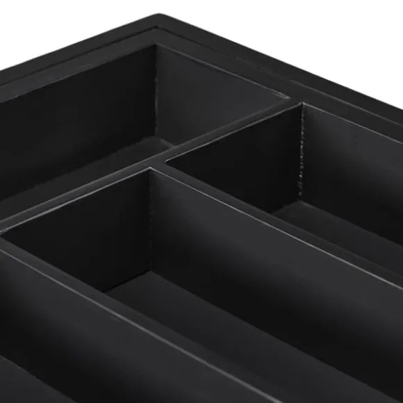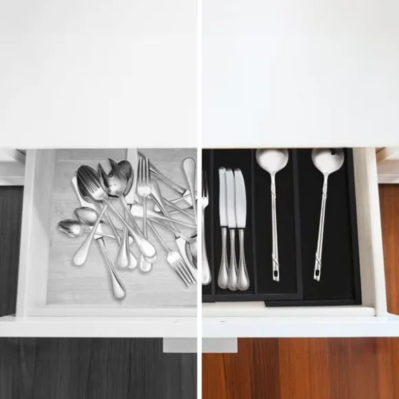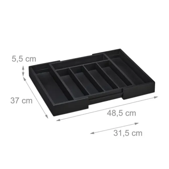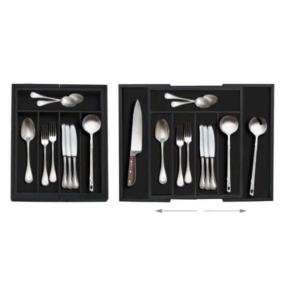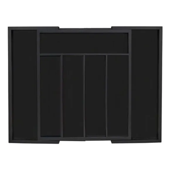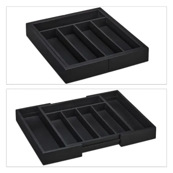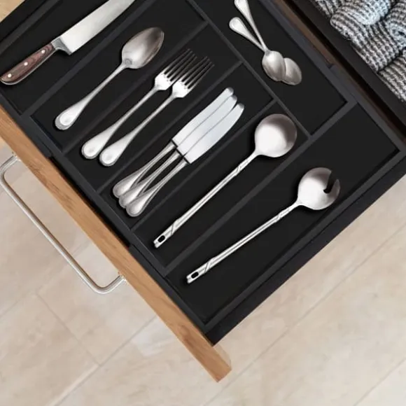 Håll dina kökslådor organiserade med denna utdragbara besticklåda i bambu, utformad för att snyggt sortera knivar, gafflar, skedar och andra köksredskap. Den justerbara bredden och de flera facken gör den lämplig för både små och stora lådor, medan den eleganta svarta finishen ger en stilren touch. Tillverkad av naturlig bambu, är den även idealisk för att organisera pyssel- och sysaker.