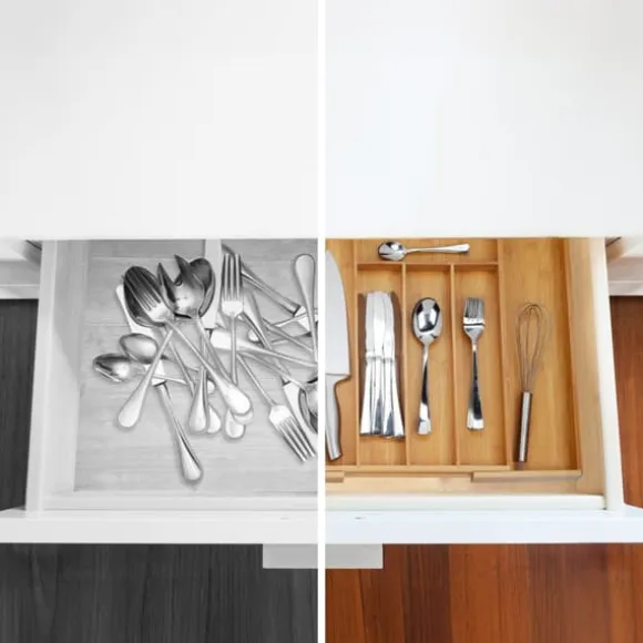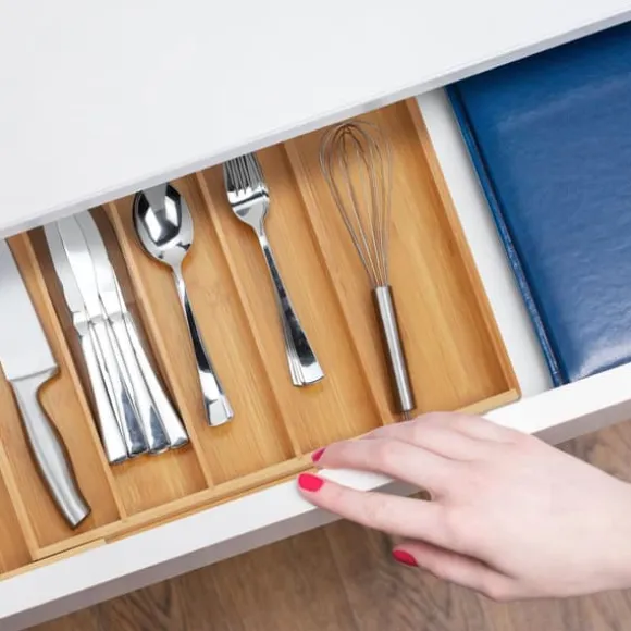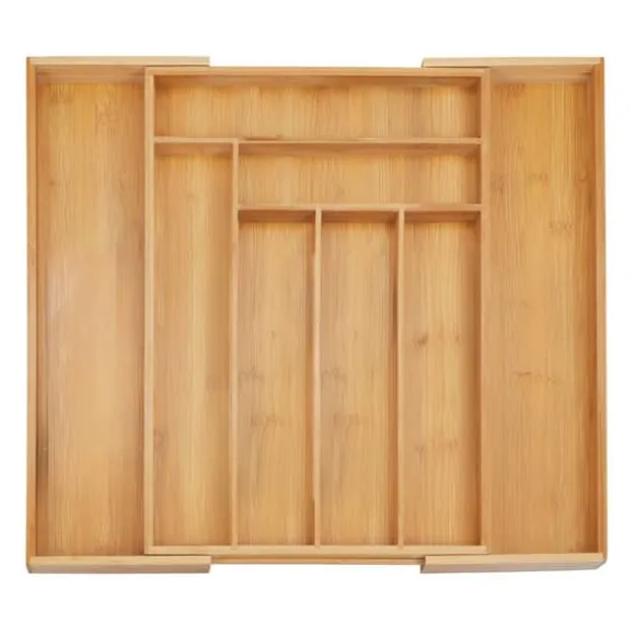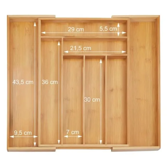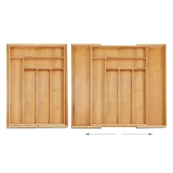 Håll dina kökslådor prydliga och organiserade med denna utdragbara besticklåda i bambu, designad för att rymma olika typer av bestick och kökstillbehör. Med flera justerbara fack passar den både små och stora lådor och erbjuder mångsidig förvaring för bestick, hantverks- eller sybehör. Tillverkad av naturlig bambu är denna robusta organisatör både hållbar och miljövänlig.