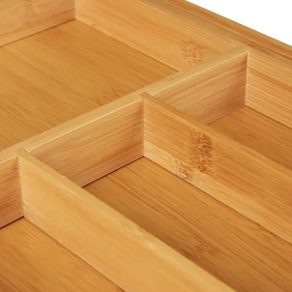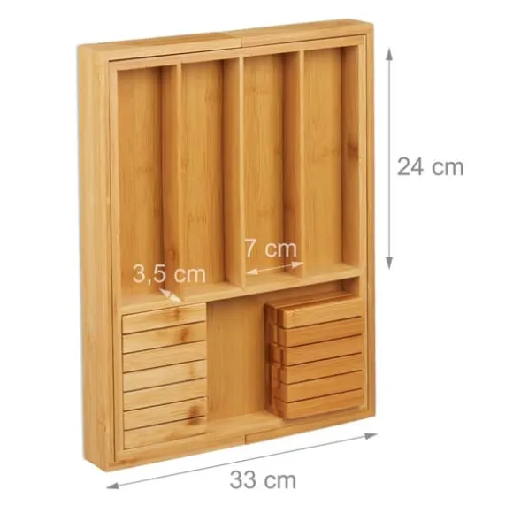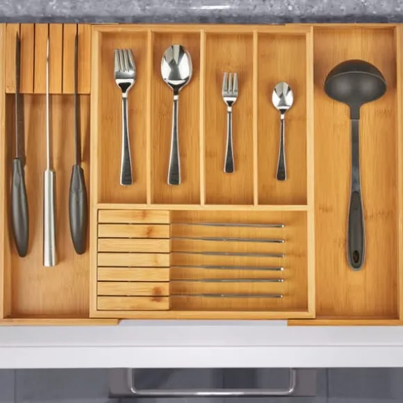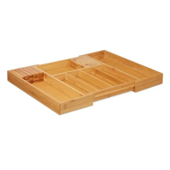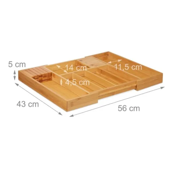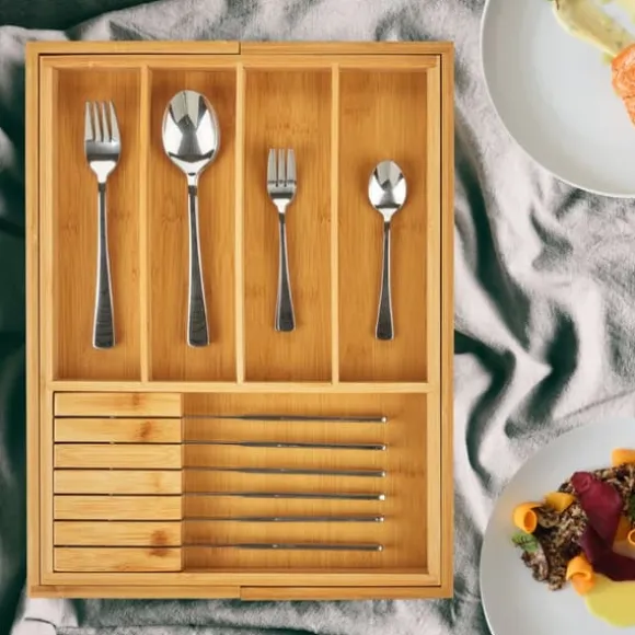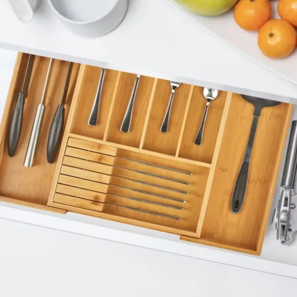 Håll ditt kök eller arbetsutrymme organiserat med denna utdragbara besticklåda i bambu, designad för att passa olika lådstorlekar med sina justerbara sidor. Flera fack och dedikerade knivblock ger säker och effektiv förvaring av bestick, köksredskap och vassa blad. Tillverkad av robust och lättskött naturlig bambu är denna låda även idealisk för att organisera skrivbord och arbetsbänkar.