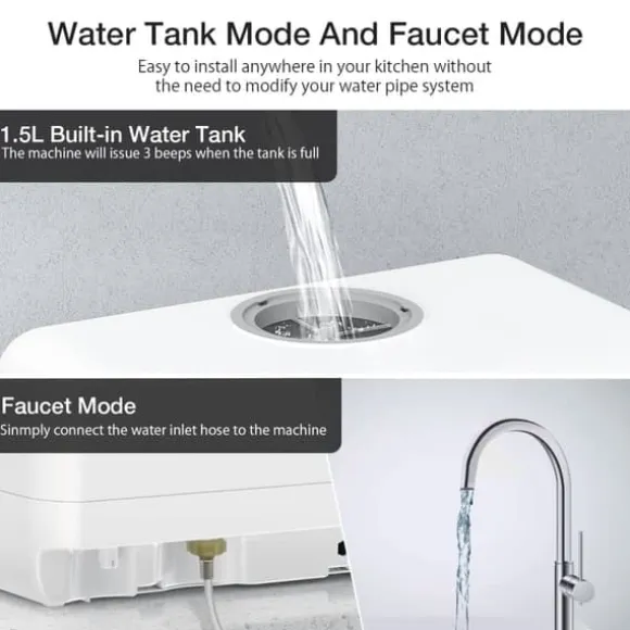 ● Vatteninlopp dubbelt läge: du kan fylla på vatten direkt i tanken eller ansluta diskmaskinen till kranen, vilket innebär att du inte behöver oroa dig för att byta vattendrag och skåp. Den är också idealisk för små hem, lägenheter, sovsalar, båtar och husbilar/husbilar.