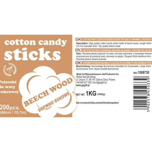 Högkvalitativa sockervaddsstavar av bokträ, avsedda för tillverkning av sockervadd på pinne.