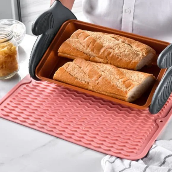 Denna bordstablett är lätt att förvara eftersom den kan vikas ihop utan att deformeras, vilket gör den bekväm att rengöra och återanvända och fungerar som ett praktiskt kökstillbehör. Dess breda användningsområde sträcker sig bortom matanvändning, eftersom den också kan fungera som husdjursmatta, kylskåpsfoder eller för olika andra ändamål.