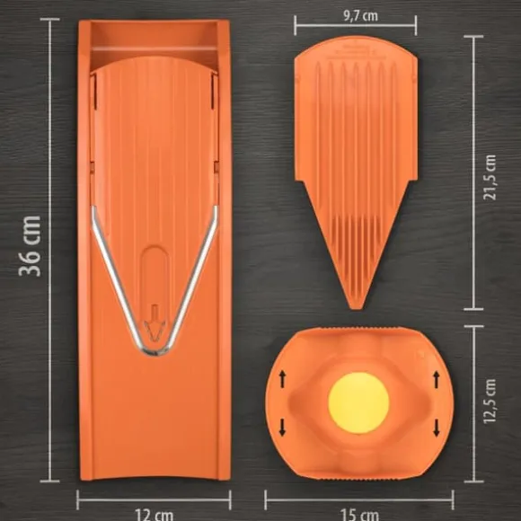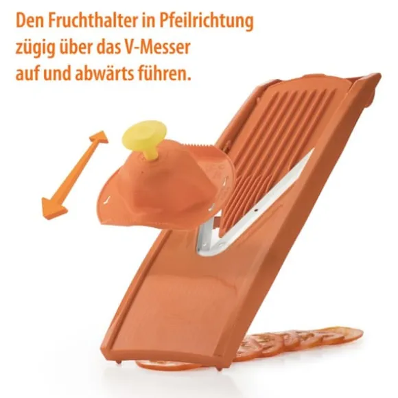 En enhet som kombinerar snabbt, exakt, enkelt och säkert arbete… Med köksskäraren V1 ClassicLine finns svar på alla frågor. För med den förädlas grönsaker och frukt på exakt samma sätt och inom väldigt kort tid. När allt kommer omkring bör det inte uppstå tristess när man lagar läckra och hälsosamma rätter och det ser den här smarta köksassistenten till. Startsetet innehåller olika insatser, som gör att du kan skära ingredienser i tre olika tjocklekar. Du får även två knivinsatser med vilka du kan göra pennor och kuber av grönsaker och frukt. Du kan använda den för att förhöja läckra grytor, sallader eller olika pannfriterade rätter och ha jättekul när du förbereder din mat. När du förbereder, använd den medföljande säkerhetsfrukthållaren, med vilken du säkert kan förbereda frukten och grönsakerna. Dina fingrar är alltid skyddade från de knivskarpa bladen i rostfritt stål. Skivmaskinen kan enkelt rengöras genom att hålla den under rinnande vatten. Använd de medföljande knivinsatserna för fina råa grönsaksstavar (med 3,5 mm insatsen) eller förbered dina egna pommes frites med 7 mm knivinsatsen. Dessutom kan startsetet utökas, till exempel med 10mm-öppningen, med vilken du kan göra tjocka pennor. Det finns därför inga gränser för matlagning. Finns i färgerna vit, röd eller orange Set bestående av: V1 ClassicLine grönsaksskärare, säkerhetsinlägg, skivinsats, 3,5 mm knivinsats, 7 mm knivinsats, säkerhetsfrukthållare V1 ClassicLine skivare är fria från BPA och mjukgörare. Kan utökas individuellt med knivinsatser, dockningsstation eller glidbox Användning och rengöring Skivarens mått: 36x12cm, 358g