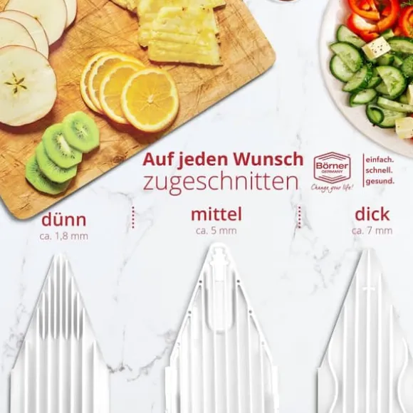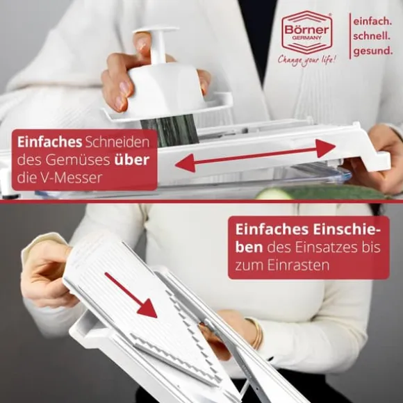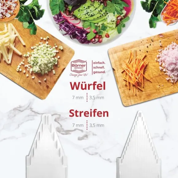 - Med V3-skäraren från Boerner kan du nu skära dina grönsaker i 2 olika skärtjocklekar. Att tillaga grönsaker har aldrig varit så snabbt och enkelt.