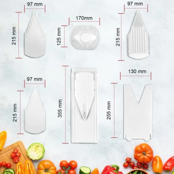 - Med den här skärmaskinen kan du även skära grönsaksstavar och -tärningar i 2 olika skärtjocklekar