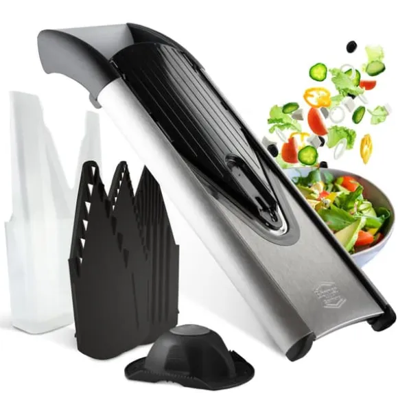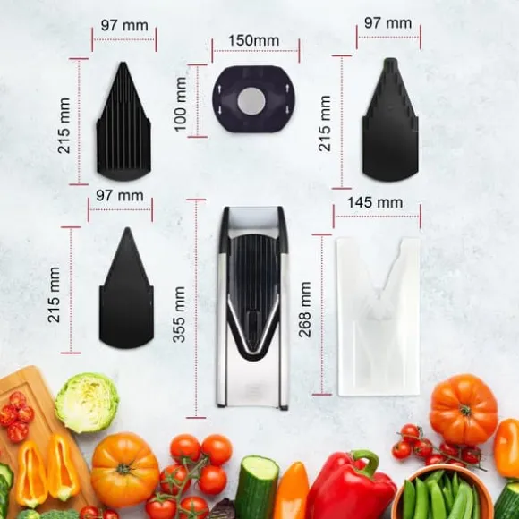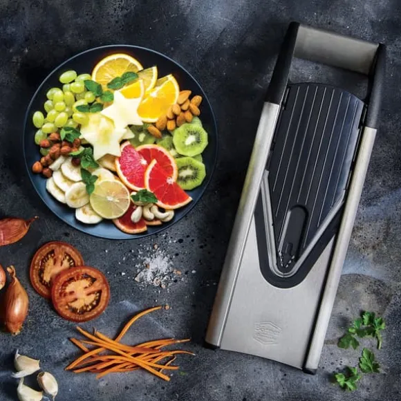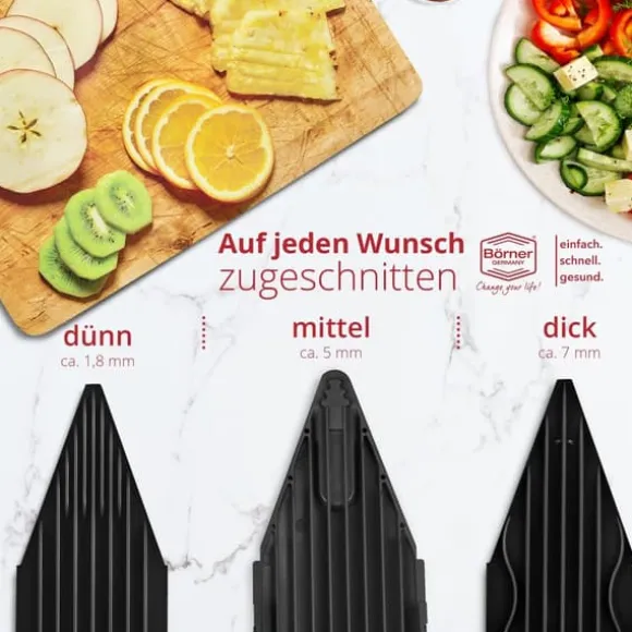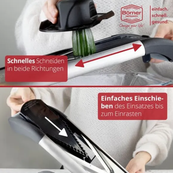 Den ursprungliga Boerner V6 ExclusiveLine är den rostfria versionen av vår populära Boerner V3. Oavsett om det är tjocka, tunna eller oblattunna skivor, fina strimlor (julienne) eller grova stavar (pommes frites), det finns många möjligheter. Genom att först skära frukten med en kniv får du tjocka tärningar till exempelvis soppor och grytor. Den eleganta looken i borstat rostfritt stål understryker V6:ans funktionella och moderna design. Setet består av den rostfria ramen, skivinsats, 3,5 mm knivinsats, 7 mm knivinsats och den nya knivskyddsinsatsen som fungerar som bladskydd å ena sidan och som insats för medelstora rutor vid vändning. I leveransomfattningen ingår även den genomskinliga multiboxen, där alla delar av V6:an kan förvaras på ett platsbesparande och dekorativt sätt. Vi rekommenderar alltid att du använder den medföljande Boerner säkerhetsfrukthållaren. En 1,6 mm och 10 mm knivinsats finns som extra tillbehör. Säker förvaring är möjlig i den matchande glidboxen. Rengör helt enkelt under rinnande vatten efter användning. Produktdata: Slitsar för skivor i två skärstyrkor 3,5 mm knivslits för remsor och kuber 7,0 mm knivslits för remsor och kuber Säkerhetsspår (för att skydda mot skador) Säkerhetsfrukthållare transparent multibox för säker och dekorativ förvaring Höjd: 40 cm , bredd 13,5 cm. Vikt 500g fri från mjukgörare och BPA