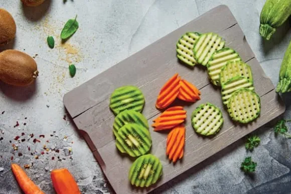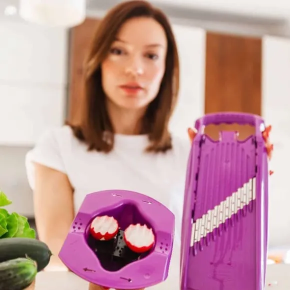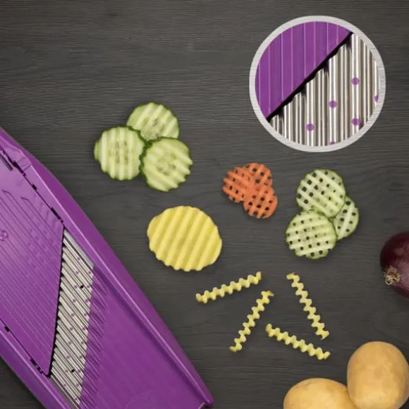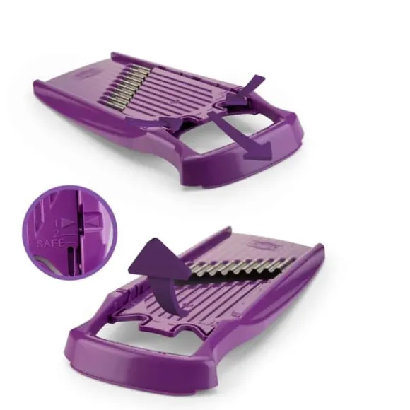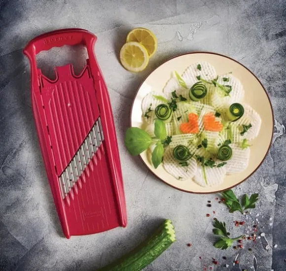 SKÄR GRÖNSAKER I VÅG- OCH VÅFFELFORM Med den ursprungliga Boerner PowerLine våg-/våffelskäraren kan du skära vågor och våfflor i tre olika tjocklekar från fast frukt och grönt. Du äter med ögonen – den fantasifulla looken ger verklig variation till tallriken. Skär snygga vågor, våfflor eller galler av frukt och grönsaker. Med den ursprungliga Boerner PowerLine våg-/våffelskäraren kan du skära vågor och våfflor i tre olika tjocklekar från fasta frukter och grönsaker, perfekt för stekta potatisvåfflor, oavsett om det är som tillbehör till biff och andra kötträtter eller helt enkelt som mellanmål för doppning. Den fantasifulla looken ger variation till tallriken. Barn som vanligtvis inte gillar att äta frukt eller grönsaker kommer att bli förtjusta i äpplen, morötter och liknande som ovanliga tillbehör i vågiga eller våfflor. Den integrerade barnsäkerhetsanordningen är helt ny för denna märkesprodukt. Skjut helt enkelt spåret hela vägen framåt och bladen är säkert skyddade. Vi rekommenderar att du använder den ursprungliga Boerner säkerhetsfrukthållaren, tillgänglig som tillbehör för alla serier. Rengör helt enkelt under rinnande vatten efter användning. Om du vill skära vågor och gallervåfflor med en tjocklek på 15 mm, välj Boerner Wave-Waffel XXL PowerLine fri från mjukgörare och BPA Finns i färgerna: röd, orange, grön, violett och vit Kvalitet tillverkad i Tyskland: Lita på högsta kvalitet och investera i en produkt som är känd för sin hållbarhet och effektivitet. Boerner har tillverkat rivjärn, skivare och andra köksredskap av bästa kvalitet i över 60 år. Särskilt intressant för barnfamiljer: den ovanliga formen gör att äpplen, potatis och mycket mer kan användas som attraktiva sidorätter i vågiga eller våffelsnitt förbereda. Morotsnudlar gör också måltiden mycket bättre. Skäraren stannar vid ingenting: Oavsett om det är fruktskärare, morotsskärare eller rågrönsaksrivjärn – nästan alla frukter och grönsaker kan tillagas med detta praktiska rivjärn. och är därför till hjälp när man eftersträvar en hälsosam livsstil. Äta hälsosamt: Framför allt bör näring vara en sak: hälsosamt. Självklart vill Boerner stödja detta med sina produkter. Använd rivjärnet för att skära fettfria pommes frites från rödbetor eller palsternacka.