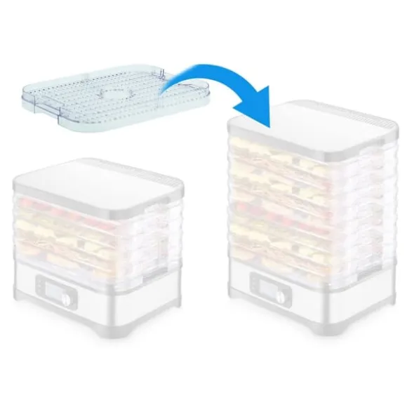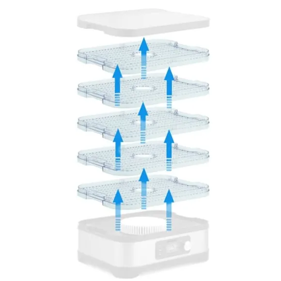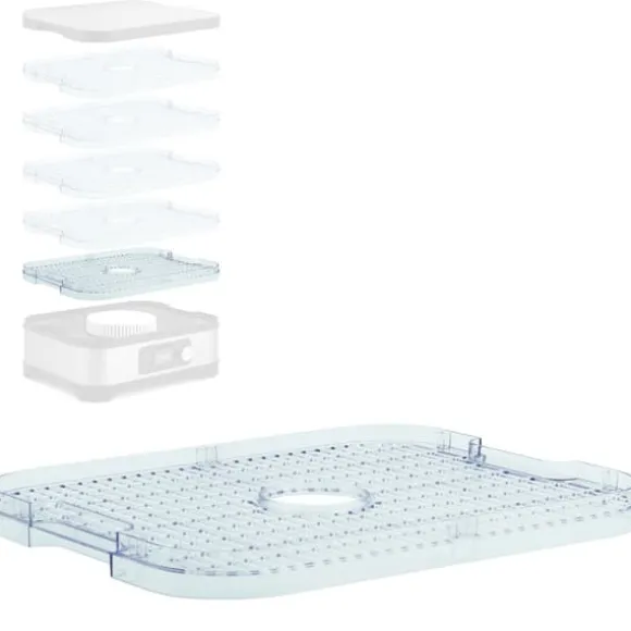 Efter torkning kan du enkelt separera torkaren i 5 separata brickor – skölj dem bara under rinnande vatten. !Silarna är utformade för att förhindra att något fastnar på dem under torkning.