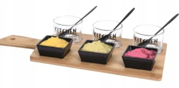 Snacksetet från EXCELLENT HOUSEWARE är perfekt för förrätter och snacks. Passar i alla kök. Oersättligt vid förberedelser av fester . Det är perfekt för att placera förrätter på det – både varma och kalla. Setet innehåller ett bambubräda och 6 skålar – 3 transparenta med 3 skedar och 3 keramik. Skålarna är användbara för att servera såser, dippsåser och små snacks. Detta är en utmärkt presentidé!