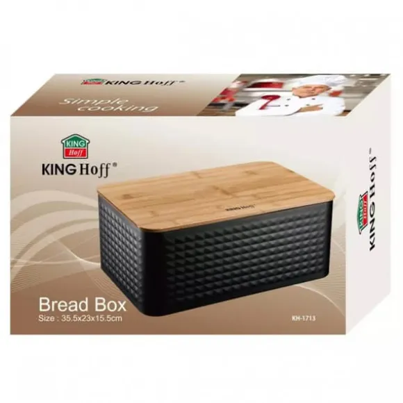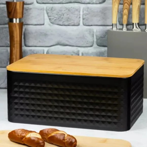 En köksbrödslåda kommer att vara användbar för alla som vill förvara bröd ordentligt. Utöver sina praktiska funktioner är brödbehållaren också en intressant inredning. Brödlådan kännetecknas av en intressant modern design. Överdraget av bambuträ kan även användas som skärbräda. Funktioner: – Materialen som används är ekologiska och hygieniska – Lätt och solid konstruktion med diamantprägling – Designad för förvaring av alla typer av bröd – Storlek: 35,5x23x15,5cm – Färg: svart