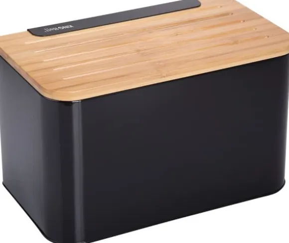 Specifikation: Brödlådans mått: 35 x 20,4 x 21,5cm Ytterligare information: Brödlåda av kolstål täckt med svart emalj Skjutlock av bambuträ – kan användas som skärbräda Lätt att öppna Avsedd för förvaring av alla typer av bröd Attraktivt , modern design Förpackning: färgad kartong