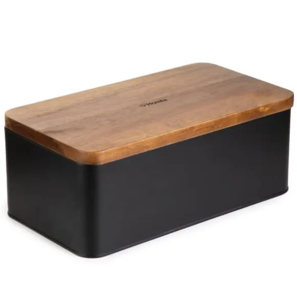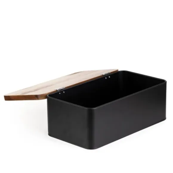 Den snygga HOMLA LOMAS brödlåda kommer att vara ett underbart komplement till din köksinredning. Vi kompletterar den svarta kroppen med ett lock i akaciaträ, som gläder sig med sina vackra färger och naturliga missfärgningar. Locket är gångjärnsförsett, vilket gör att du enkelt kan lyfta upp det för att ta ut bröd. Förutom sin snygga design är brödlådan också funktionell. Bröd som förvaras inuti skyddas från fukt och ljus, vilket håller det färskt och gott längre.