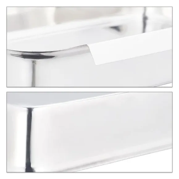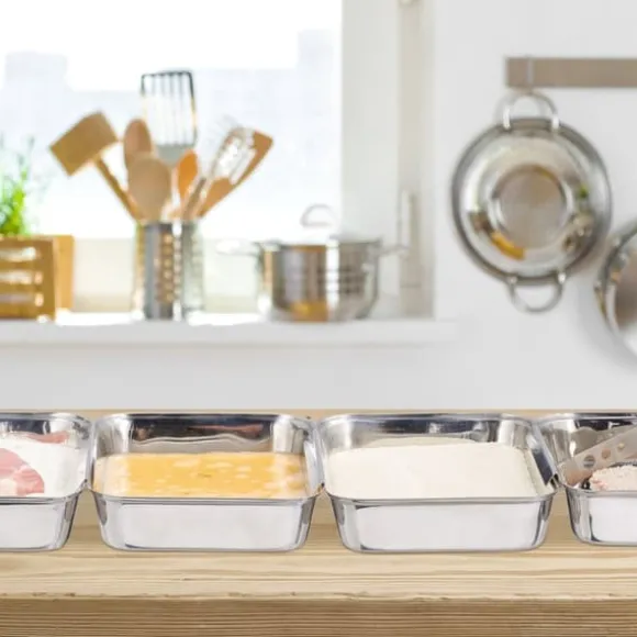 Detta set med paneringsbrickor i rostfritt stål är perfekt för smidig och kladdfri matlagning, så att du enkelt kan panera eller bröa kött, fisk och grönsaker. Brickorna kan enkelt hakas ihop, vilket skapar en effektiv arbetsstation och minimerar spill, medan de medföljande tången gör doppning och panering enkel. Hållbart, rostfritt och diskmaskinssäkert – detta set är idealiskt för både hemmakockar och matentusiaster.