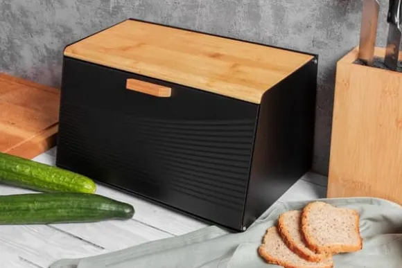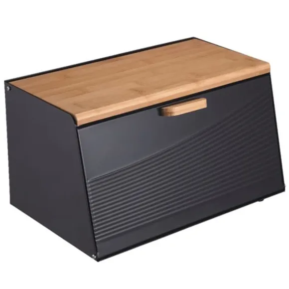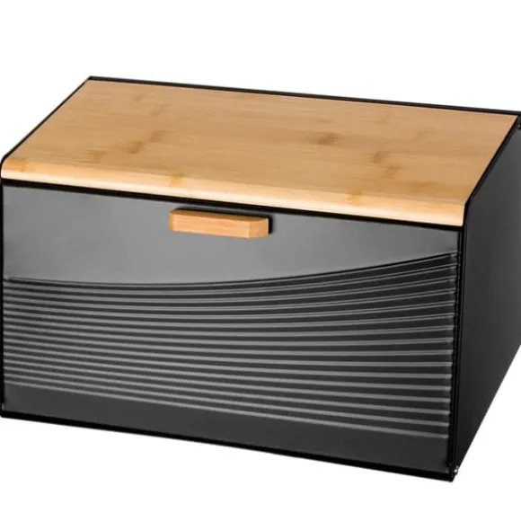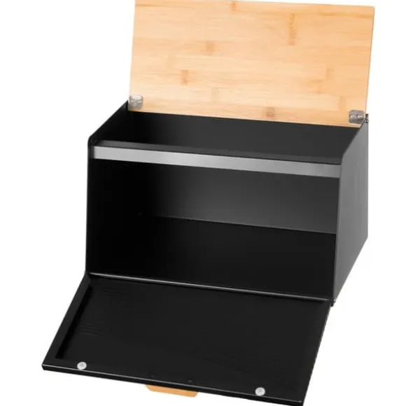 Brödkärl i stål och trä från Brunbeste Stomme av svartlackerat rostfritt stål. Topplock av ljust trä (al, boktyp), frontlock av stål med trähandtag. Möjlighet att öppna frontluckan, toppluckan eller båda samtidigt. Lätt att öppna. Sparar utrymme. Designad för förvaring av alla typer av bröd. Attraktiv, modern design. Tillverkad av ekologiska material. Förpackning: färgad kartong. Färg: svart/ljus trä. Mått på brödlådan: 35,5 x 23,5 x 21 cm