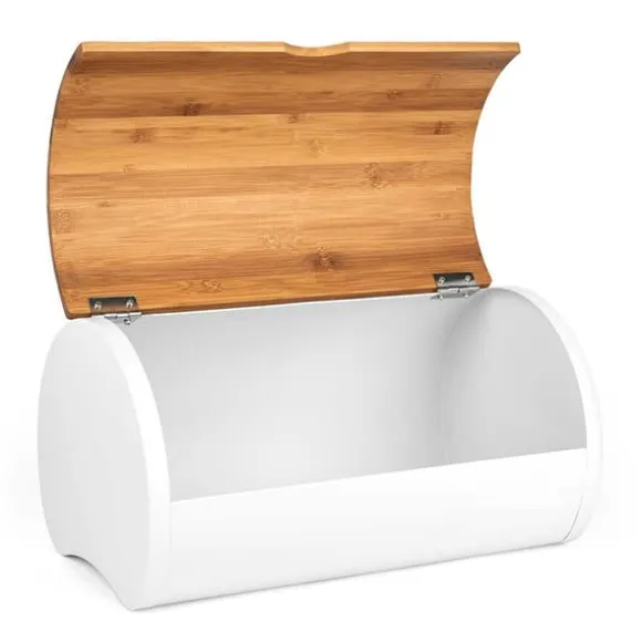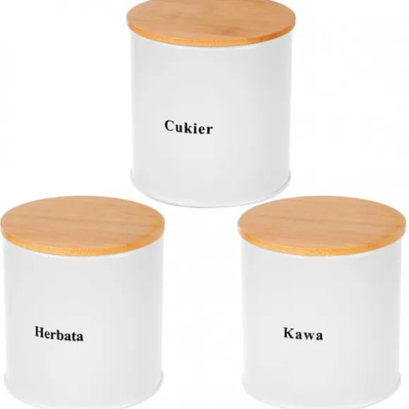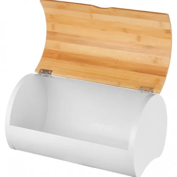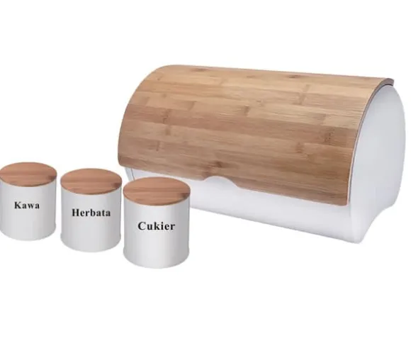 Den moderna formen på brödlådan, dess attraktiva form och kombinationen av vit metall och bambu ser bra ut på bänkskivan. Metallkroppen är pulverlackerad för ökad hållbarhet och korrosionsbeständighet. Setet innehåller 3 behållare för kaffe, te och socker. Specifikation: Stomme av lackerat rostfritt stål i matt vit. Lätt trälock Lätt att öppna. Sparar utrymme. Designad för förvaring av alla typer av bröd. Attraktiv, modern design. Tillverkad av ekologiska material. Förpackning: färgad kartong. Färg: matt vit/ljust trä. Mått brödlåda: Längd: 38 cm Bredd: 27 cm Höjd: 19 cm Behållarmått: Diameter: 10 cm Höjd: 10 cm