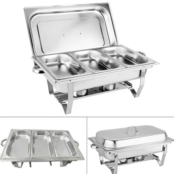Chafing dish i rostfritt stål med 3 insatser à 3 LEn rektangulär värmebehållare i rostfritt stål som håller maten varm och aptitlig vid bufféer, bruncher, catering, fester och bröllop. Tre separata matskålar på 3 L ger flexibilitet och snygg servering.