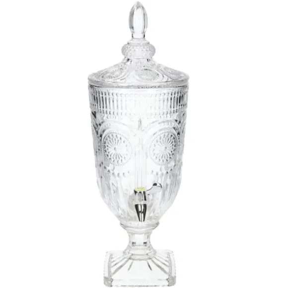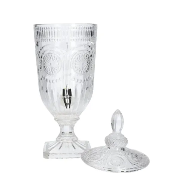 FATRUM med en kapacitet på 2,8 l är ett perfekt tillbehör för alla typer av evenemang. Tack vare användningen av transparent glas kan du övervaka innehållsnivån i realtid och bekvämt servera drycker med hjälp av den läckagesäker kran . Burken har en rundad form, vilar på en solid och stabil fot , och locket har en praktisk knopp som fungerar som ett handtag. Väggarna är dekorerade med ett strukturellt, öppet mönster som påminner om arabesker. Burken är 17 cm bred. Material